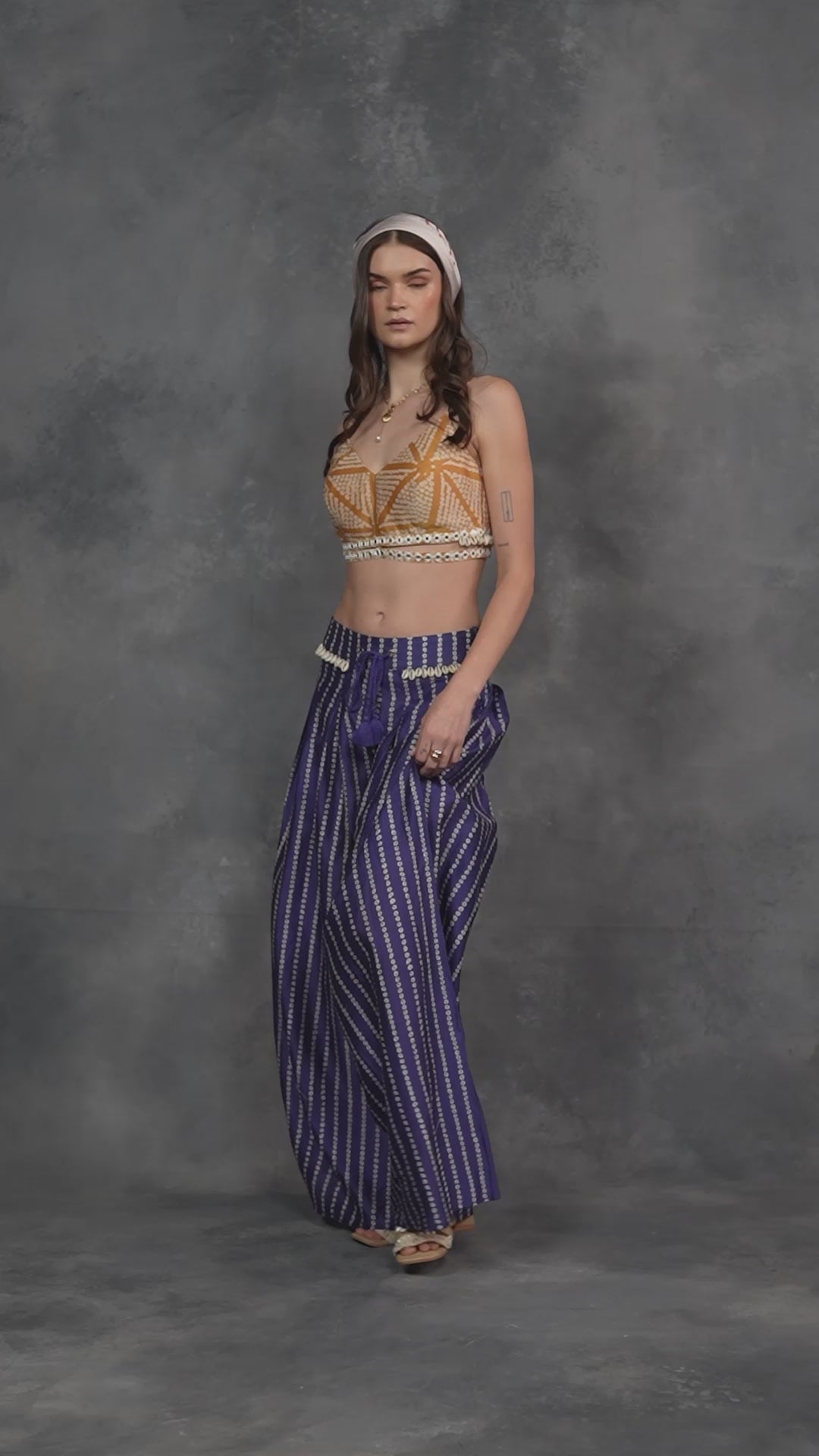 A radiant blend of contemporary allure and traditional artistry, this yellow silk bralette top embodies effortless sophistication. Accented with intricate golden patterns and delicate shell embellishments, it exudes a bohemian charm that transitions seamlessly from festive gatherings to sunlit getaways.